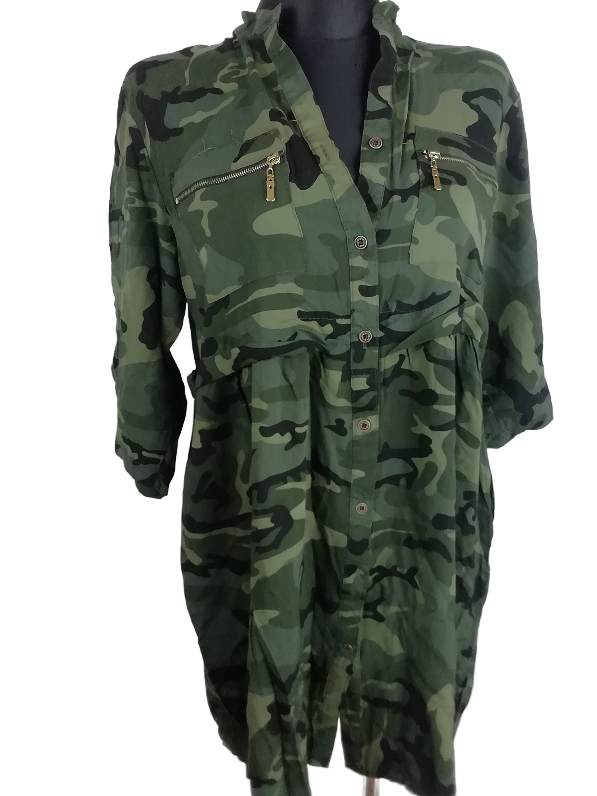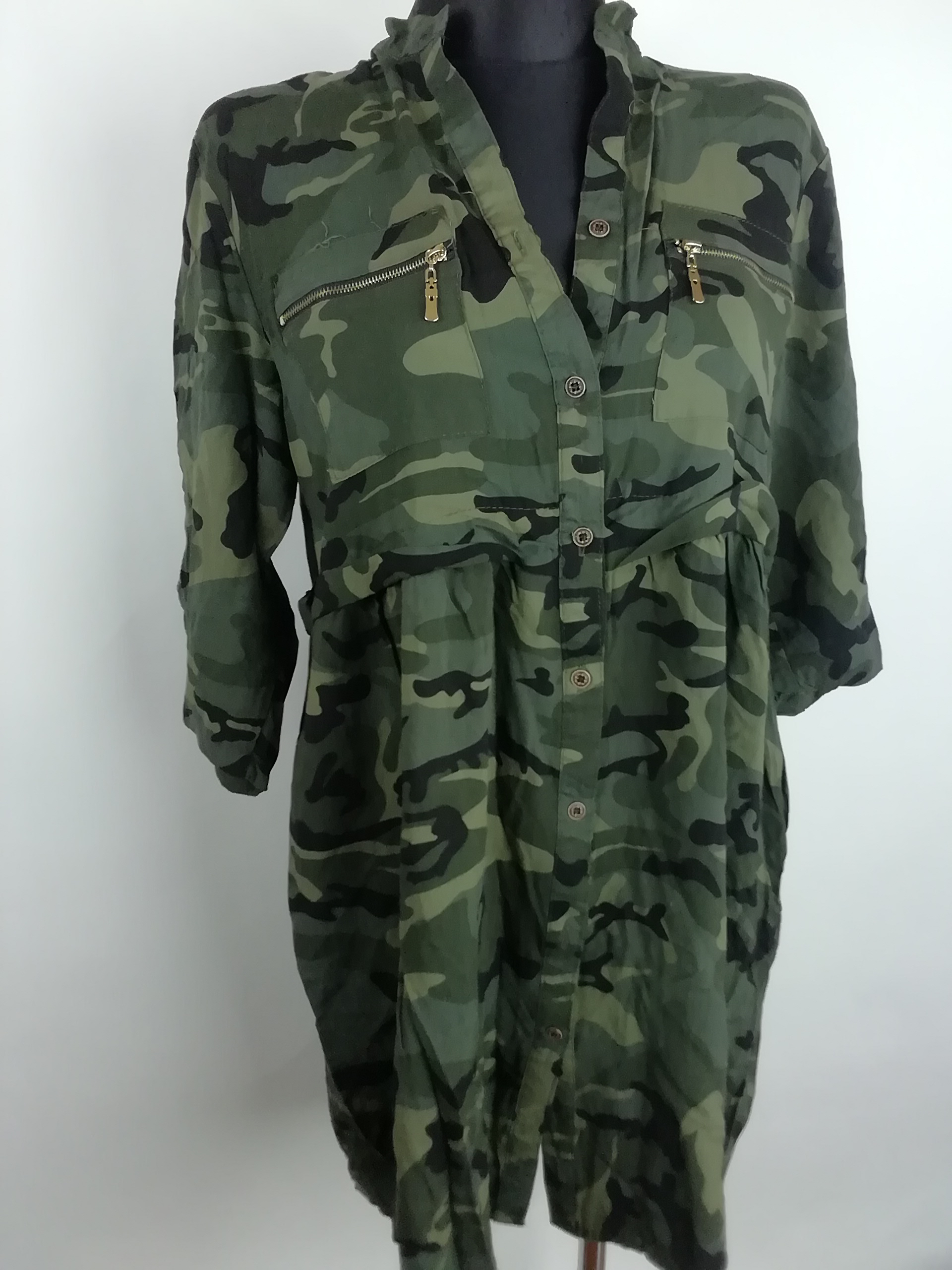 Obwód pod pachami 108 cm w pasie 110 cm biodra rozkloszowana długość 87 cm trochę się naciąga stan bardzo dobry